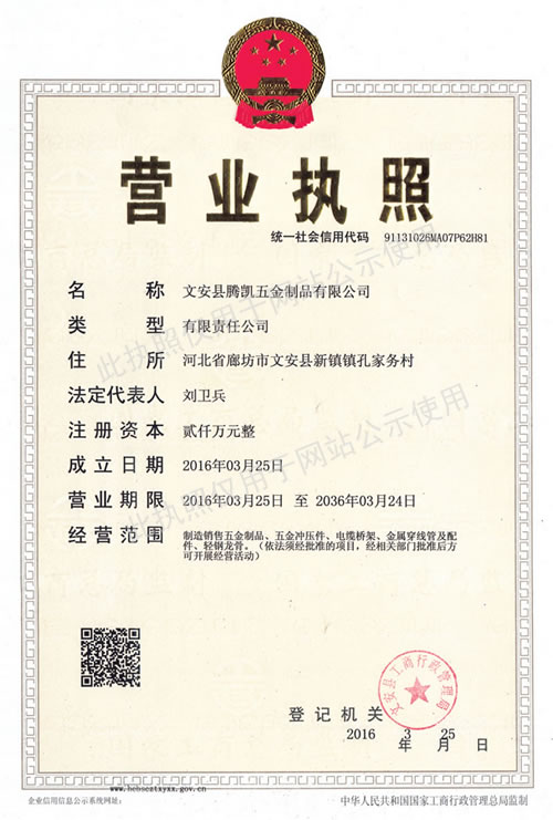 文安縣騰凱五金制品有限公司創(chuàng)建于2006年,是電纜橋架制造廠商,位于河北省文安縣新鎮工業區,東連京開線106國道,北接津保高速公路,背靠京九大動脈,地處北京、天津、保定三角地帶,交通便捷,通訊發(fā)達。